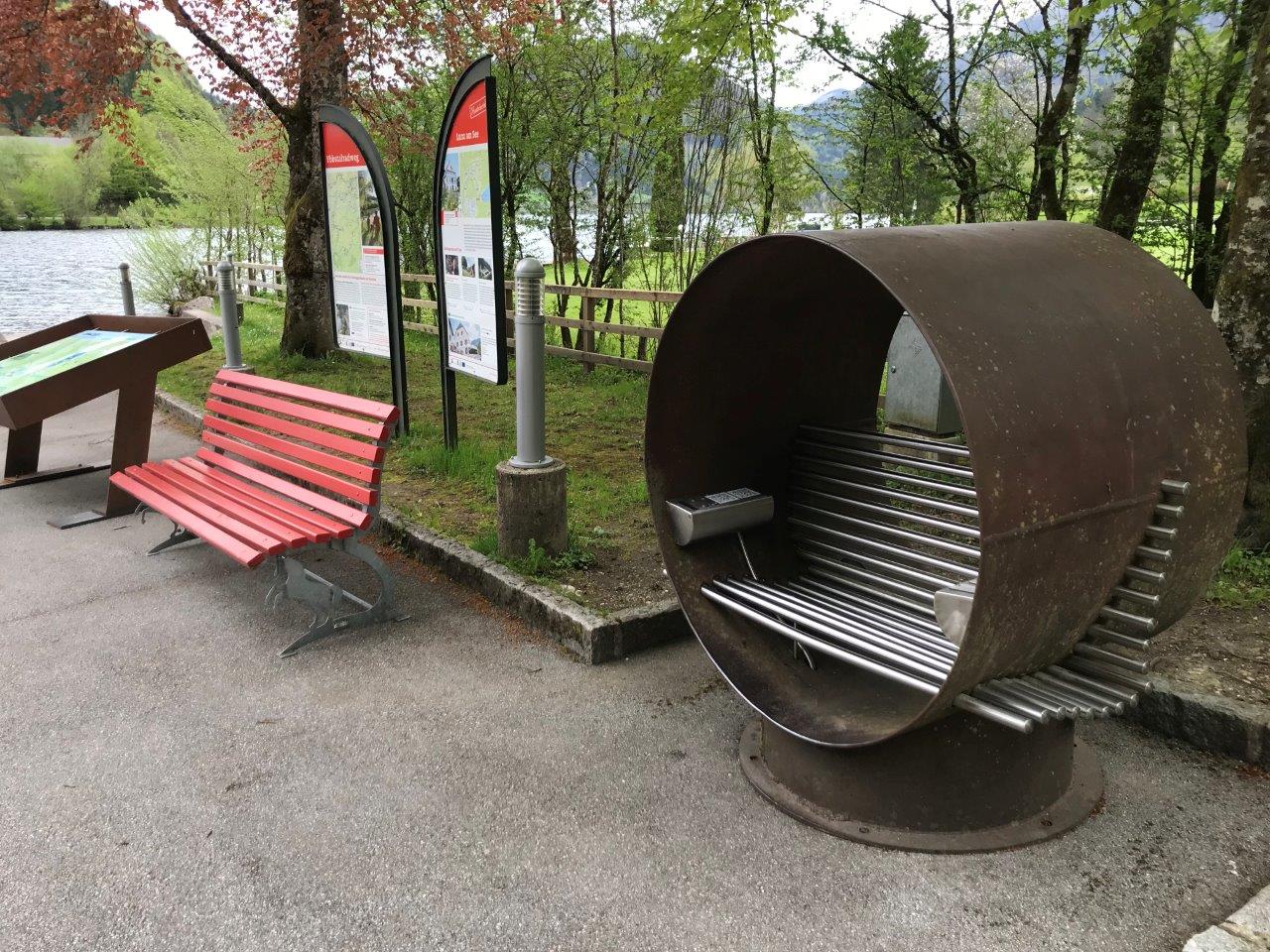 Der Hörsessel befindet sich auf der Seepromenade bei der Bootsvermietung am Lunzer See und lädt zum Rasten und Verweilen mit Blick auf den See ein.