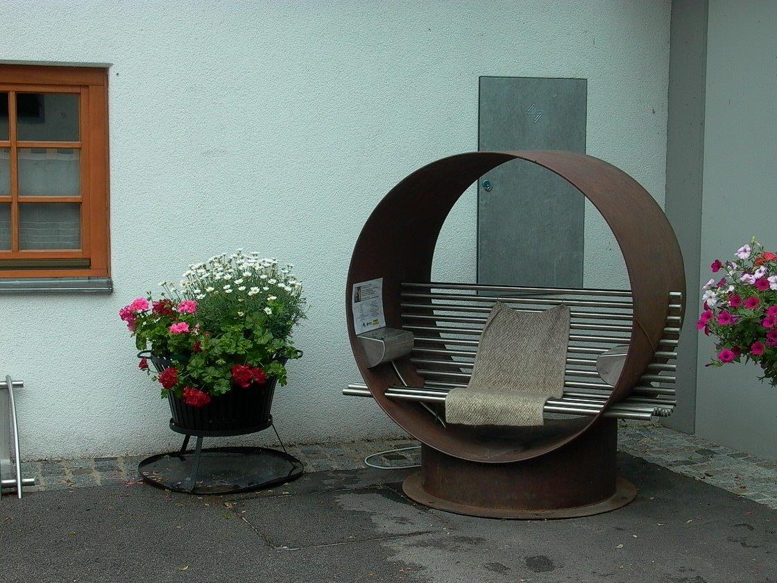 Der Hörsessel befindet sich direkt am Vorplatz zum Gemeindeamt in Opponitz mit Blick Richtung Fischerbrunnen.